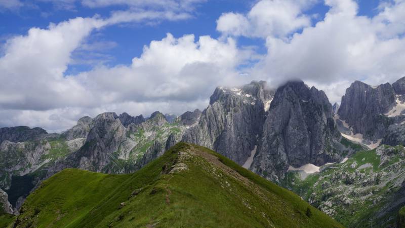 🗻Prokletije-gebergte: is een van de meest ongerepte en ruige bergketens in de Balkan. Het uitzicht over de steile kliffen, diepe kloven en groene valleien is adembenemend.