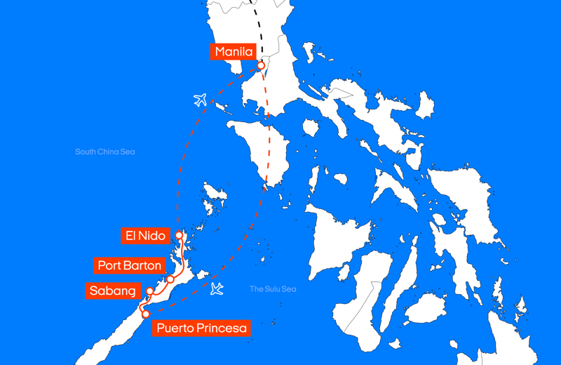 Tijdens deze individuele rondreis van 2 weken bezoek je een van de mooiste eilanden van de Filipijnen. Verblijf in de mooiste accommodaties in Puerto Princesa, Port Barton en El Nido. Je zal je geen moment vervelen! Al je vervoer en accommodatie is geregeld, maar je activiteiten liggen nog niet vast. Jij kiest dus volledig zelf wat je waar gaat doen! Geen zorgen, we hebben geweldige activiteiten die we graag voorstellen en vastleggen voor jou.