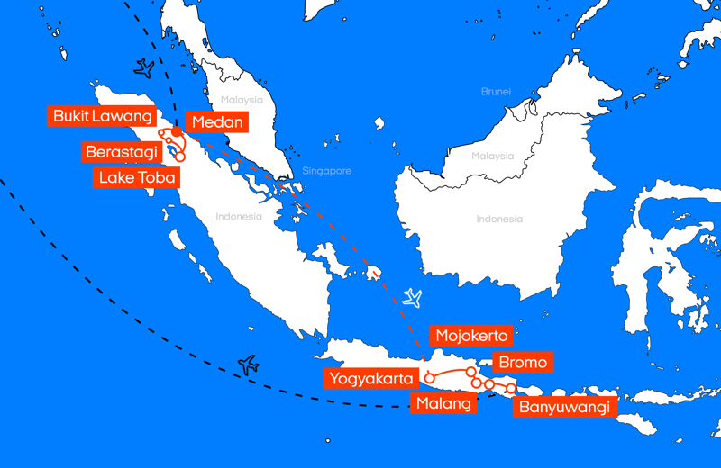 Je avontuur begint in Medan, de bruisende hoofdstad van Noord-Sumatra. Vanuit Medan reis je naar Bukit Lawang, waar je je wandelschoenen aantrekt voor een trektocht naar een jungle camp. Hier krijg je de kans om orang-oetans in hun natuurlijke omgeving te spotten. Na de jungle-ervaring ga je verder naar Berastagi, een stad omringd door vulkanen en fruitmarkten. Vergeet niet om de indrukwekkende tweelingvulkaan, Sibayak, te bezoeken. Je volgende stop is Lake Toba, het grootste vulkanische meer ter wereld, waar je kunt ontspannen en genieten van de serene omgeving. Vanuit Lake Toba wordt je opgehaald en naar het vliegveld gebracht voor je vlucht naar Java.