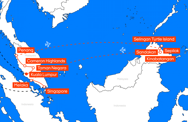 Tijdens deze individuele rondreis van 19 dagen bezoek je de mooiste plekjes van Maleisië. Reis van Kuala Lumpur naar Melaka en stop onderweg in Taman Negara, Cameron Highlands, Penang, Sendakan, Sepilok en Kinabatangan. Je zal je geen moment vervelen! We hebben een aantal geweldige activiteiten toegevoegd aan dit reisvoorstel, maar we kunnen alle activiteiten op maat voor jou regelen.