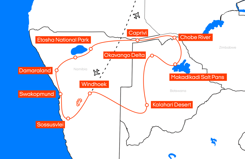 Je reist door de eeuwenoude woestijn, spot fascinerende dieren in Damaraland en Etosha, en ontdekt de rijke wetlands van de Caprivi, Chobe en de Okavango Delta. En natuurlijk mag het wonder van de Victoria Falls niet ontbreken. Het wordt moeilijk om een favoriet te kiezen! De tour begint en eindigt in Windhoek, maar je kunt er ook voor kiezen om te starten en te eindigen in Chobe National Park of bij de Victoria Falls.