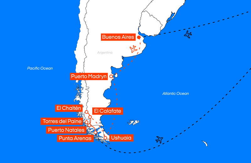 Vanuit Puerto Madryn steek je de uitgestrekte Patagonische steppe over en arriveer je in El Calafate, de thuisbasis van de indrukwekkende grote gletsjers, meren en bossen. Hier krijg je de kans om de adembenemende natuur van dichtbij te ervaren en kun je het nabijgelegen Torres del Paine bezoeken, een van de meest spectaculaire nationale parken in Chili. Ten slot vlieg je over de steppe naar het eiland Tierra del Fuego en bezoek je Ushuaia, de meest zuidelijke stad ter wereld, ook wel bekend als de 'Stad aan het einde van de wereld'. Dit avontuur zul je niet snel vergeten!