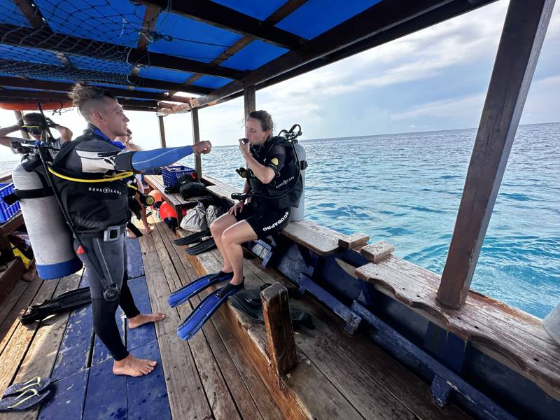 Tijdens mijn reis had ik het gevoel dat alles een hoogtepunt was. De tijd vloog voorbij en er was nooit een saai moment. Als ik toch een moment moet kiezen dat ik voor altijd zal onthouden, zou dat mijn eerste keer diepzeeduiken zijn. Op mijn avontuur had ik een paar kansen waar ik kon duiken, maar mijn eerste keer was in Ahmed. Ik ben zo gelukkig dat ik mijn eerste duik hier mocht beleven, omdat je van het duikcentrum rechtstreeks op het strand en in het water kan wandelen. Daarvoor mocht ik oefenen in het zwembad van het duikcentrum. Het programma dat ik volgde heette 'Discover Scuba Diving', dit bestond uit een kennismaking met het PADI-brevet, het juiste wetsuit passen en de juiste tank vinden voor je in het zwembad dook. Ik was de enige newbie van de groep die nog nooit een duik had gemaakt in de oceaan, maar de instructeur was super behulpzaam en geduldig, zowel wanneer we ons klaarmaakten voor het zwembad als voor de oceaan. Het was allemaal heel erg professioneel. Omdat het duikcentrum op het strand is, is het uitzicht prachtig, en het helpt ook dat je zelf rustig het water in kan gaan in plaats van dat je van een boot springen.